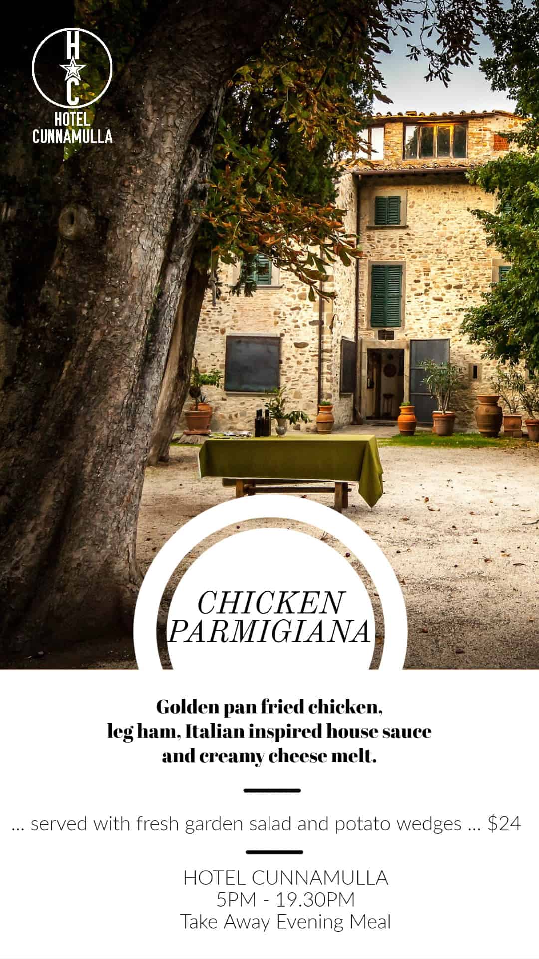 Traditional Italian inspired Chicken Parmigiana with Leg Ham, fresh garden salads and potato wedges from Hotel Cunnamulla’s kitchen restaurant.