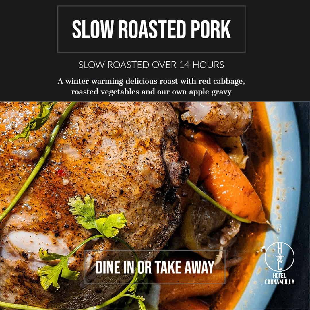 Slow roasted over 14 hours, winter warming roast pork and crackling with red cabbage, roasted vegetables and our own kitchen apple gravy … $24